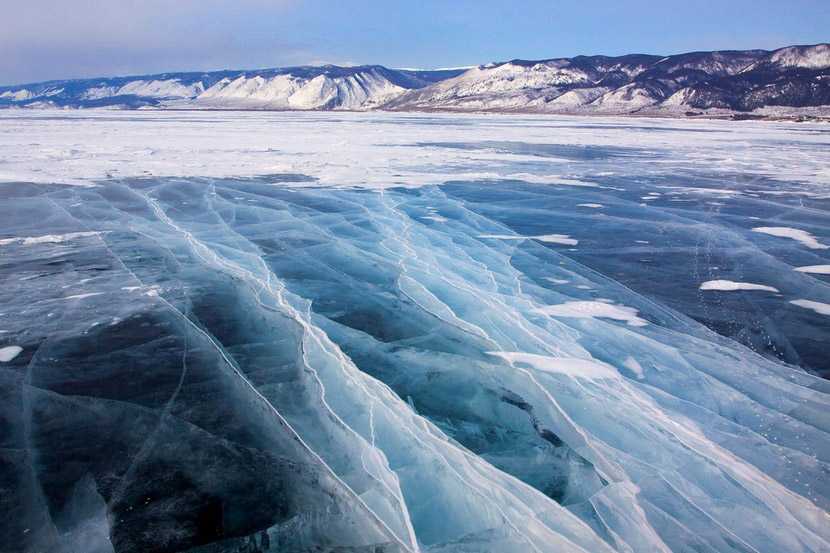 Погрузиться в ласковые и чистейшие воды Байкала… — мечта! Правда, мечта только для тех, кто знает об этом озере совсем мало. Дело все в том, что вода тут не прогревается даже летом выше отметки +9 градусов по Цельсию. Лишь в небольших и неглубоких заливах можно рассчитывать, что вода прогреется под солнцем до +16. Поэтому поплавать в Байкале и увидеть подводный мир через кристально-прозрачную воду можно разве что в гидрокостюме. Зимой водное зеркало практически полностью покрывается толстым льдом, настолько толстым, что в 19 веке на льду устанавливали шпалы и при помощи коней перевозили через Байкал паровозы. Лед на озере удивительное зрелище: во время сильнейших морозов по нему проходят трещины, длина которых составляет порой 30 (!) километров, а их ширина – 3 метра.
