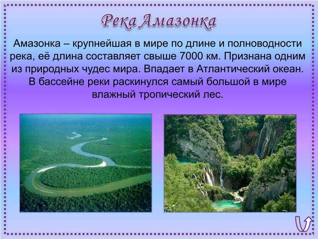 Река Амазонка: Колумбия, Эквадор и Перу есть ряд систем реки Амазонки. По объему стока эта река является крупнейшей в мире. Река Мантаро является его источником. Река Амазонка впадает в Атлантический океан. Река Амазонка протекает через Боливию, Бразилию и Французскую Гвиану. Он расположен в Южной Америке. Река Амазонка течет в обратном направлении. Ученые утверждают, что река Амазонка вытекает из ледникового ручья в перуанских Андах. Если это подтвердится, то Амазонка станет самой длинной рекой в мире.