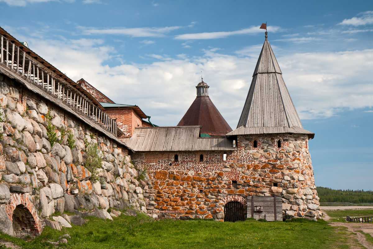 Соловецкий Кремль возводился в XVI в. в течение 11 лет, как элемент обороны. Длина стен равна 1,2 км, в высоту достигает 10 м, в толщину 7 м. Имеет 5 башен: