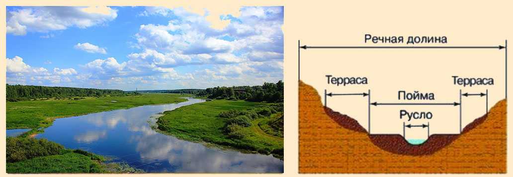 Части рек: исток – место, где река берет свое начало. Истоком может быть родник, озеро, болото, ледник в горах; устье – место впадения реки в море, озеро или другую реку. Понижение в рельефе, тянущееся от истока до устья рек – речная долина . Углубление, в котором течет река постоянно, – русло. Пойма – плоское, затопляемое во время половодья дно речной долины. Над поймой обычно поднимаются склоны долины, часто ступенчатой формы. Эти ступени называются террасами. Они возникают в результате размывающей деятельности рек (эрозии), вызванной понижением базиса эрозии.