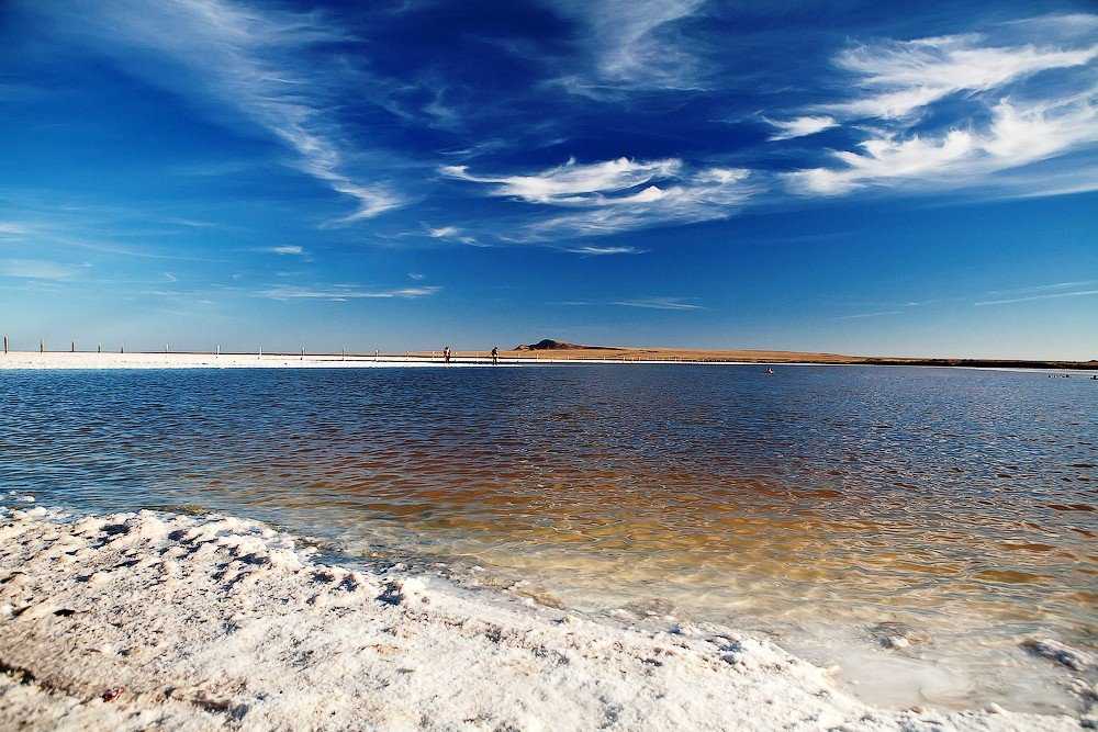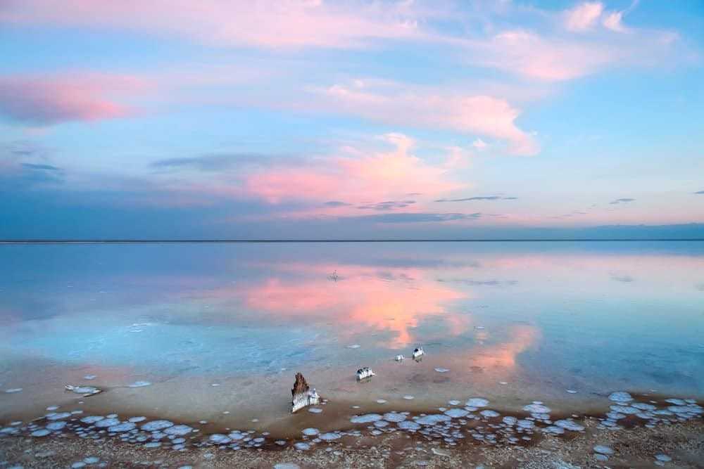 Оно завораживает своей красотой и не похоже на другие водоемы. Пейзаж скорее напоминает инопланетный: гладь воды золотисто-розового цвета, вся усыпанная сверкающими кристаллами соли.
