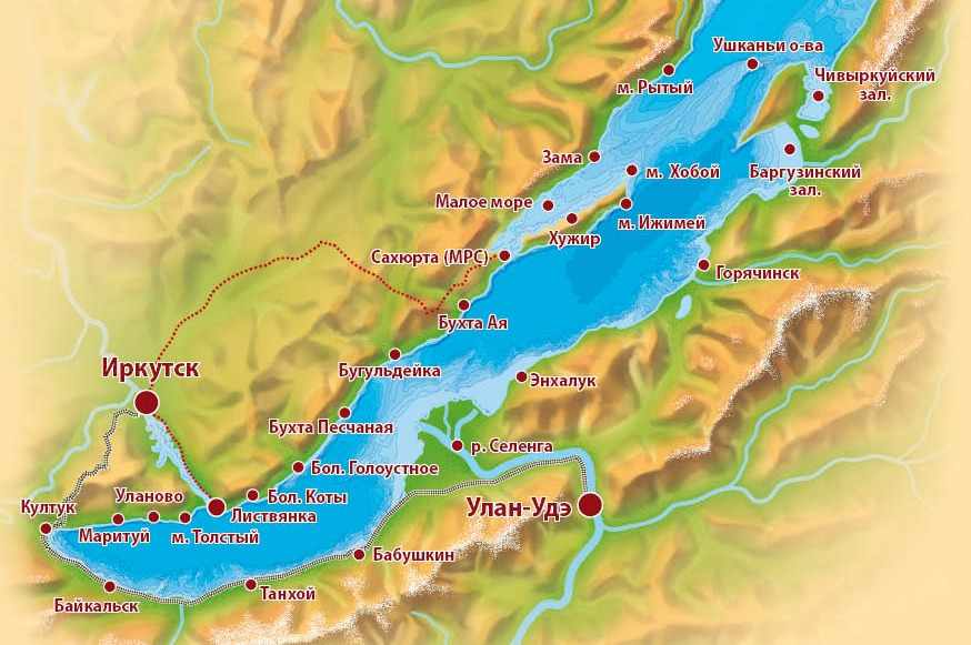 На карте озеро Байкал расположено в Восточной Сибири рядом с Иркутском и Улан-Удэ. Имеет продолговатую форму, вытянутую с юго-запада на северо-восток.