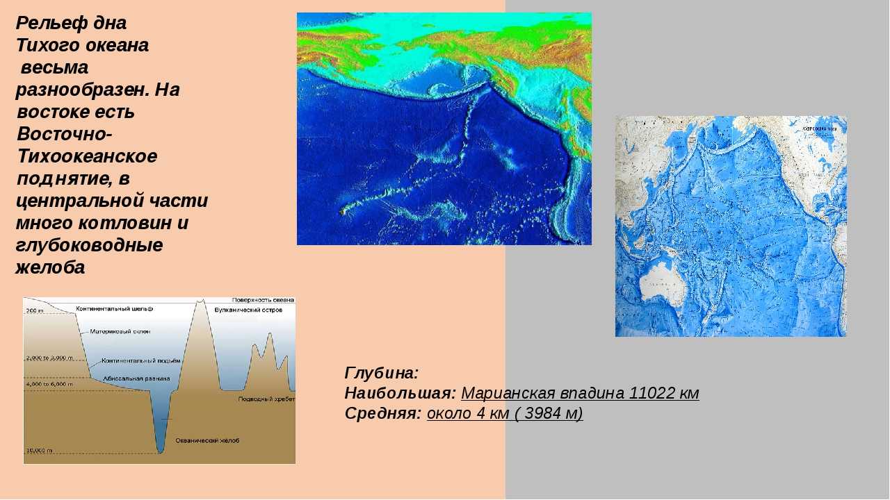 На участках перехода земной коры континентального типа в океаническую находятся глубоководные впадины, являющие собой очень узкие и длинные прогибы дна. Всего по окраинам тихоокеанской впадины размещено почти 3 десятка таких желобов, глубина которых превышает 5 тысяч метров. К крупнейшим из них относятся: