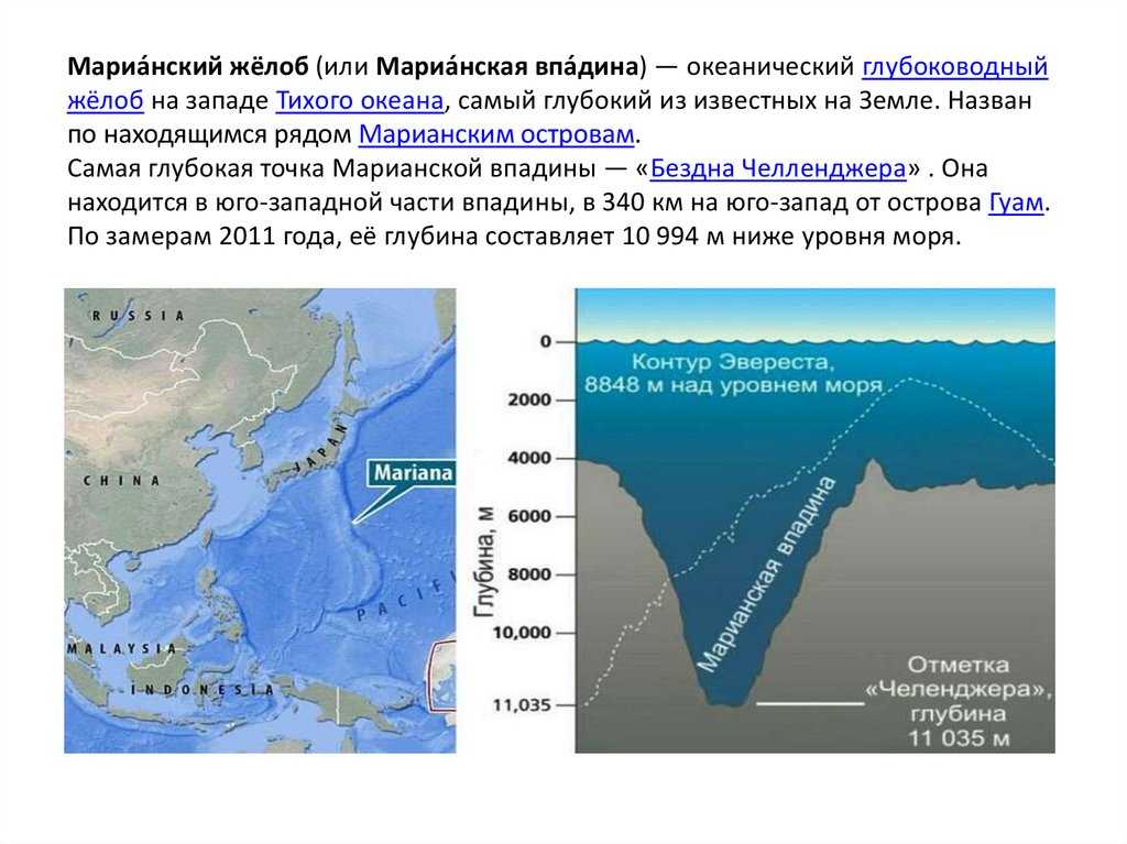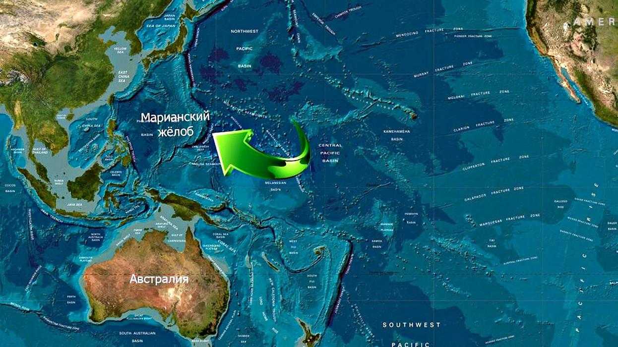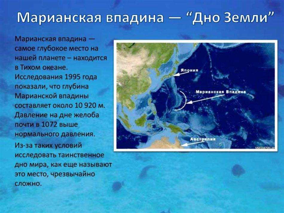 В западной части Тихого океана расположена знаменитая Марианская впадина — подводный желоб с самой большой глубиной.