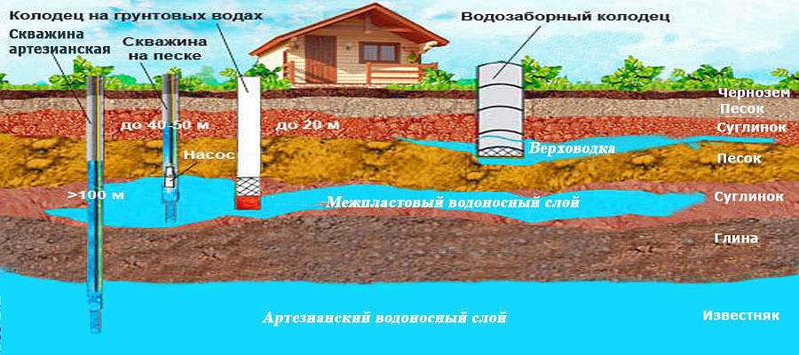Глубина водоносных пластов, напрямую зависит от местности (как правильно найти воду на участке написано здесь).