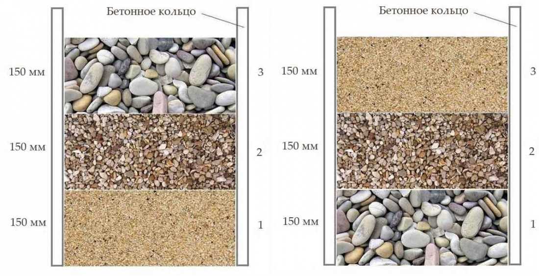 В зависимости от порядка укладки слоев каменистых фракций различают две схемы того, как можно сделать фильтр в колодце:
