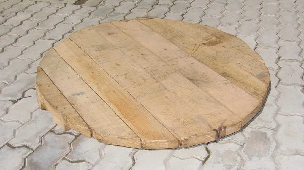 - Затем пилим круг чуть меньше внутреннего диаметра ствола колодца, примерно на 2–3 см. Готовое изделие желательно обернуть геотекстилем.