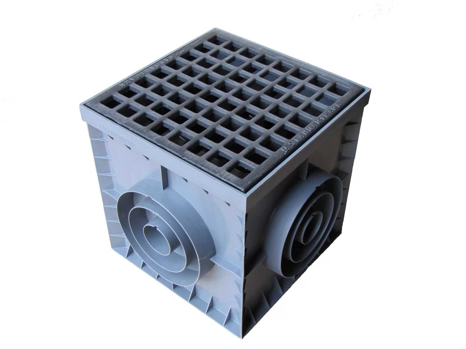 По стандарту имеют кубическую форму. С каждой стороны есть патрубки, что позволяет подключать сразу несколько труб ливневой канализации. Диаметр патрубка может колебаться от 110 до 200 мм. При их выборе можно столкнуться с особой маркировкой изделия:
