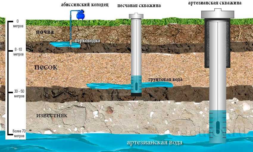 | Артезианские | На глубине 100 м и более. Колодец на такой глубине не рентабелен, поэтому бурят скважины. Они отличаются неограниченным запасом воды. |
