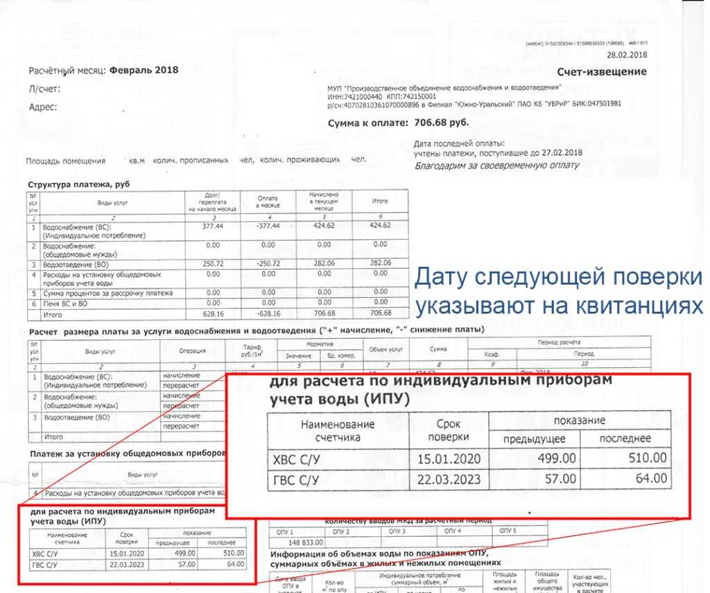 Чтобы потребитель не пропустил дату следующей поверки, управляющие или ресурсоснабжающие организации указывают эту дату на квитанциях для оплаты за ресурс.