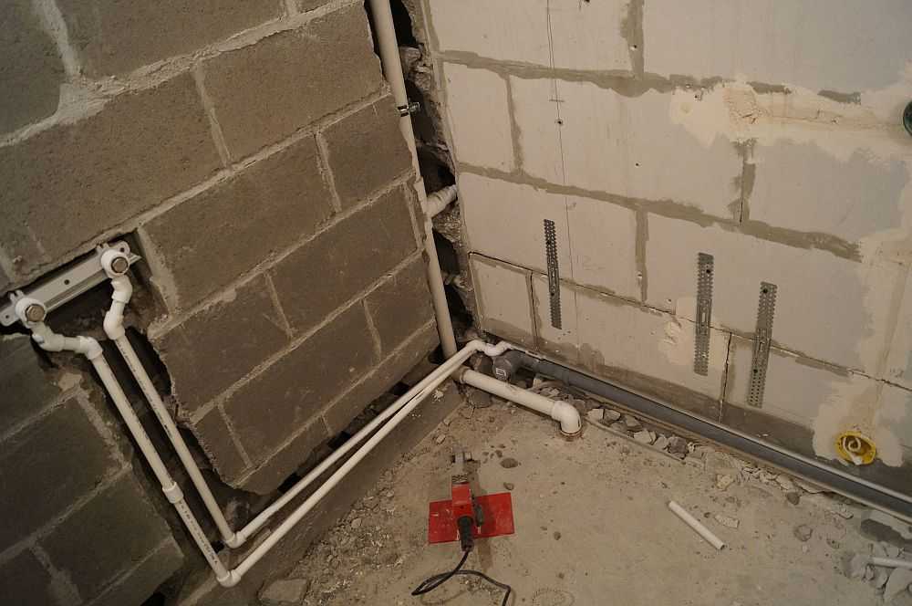 Есть и еще одна сложность при скрытой прокладке водопровода — необходимость наличия каналов в стене (штроб), в которые укладывают трубы. Во-первых, не всякая стена позволяет делать в ней штробы. Например, в панельных домах, где толщина стены всего-то около 10 см делать канал глубиной 5-6 см точно не стоит. Плита потеряет значительную часть несущей способности. Чем это грозит объяснять, наверное, не надо. Во-вторых, прокладка штроб в стене — работа эта не самая легкая, даже при наличии перфоратора отнимает много времени. Так что минусов у такого варианта более чем достаточно.